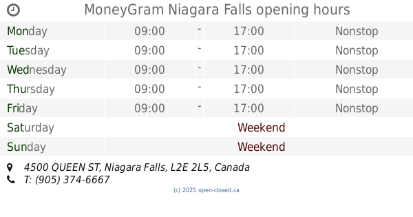 It is also possible to : Edit these OPENING HOURS of Branch MoneyGram In Niagara Falls, 4500 QUEEN ST,